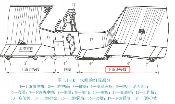 下游连接段包括护坦(消力池)、海漫、下游防冲槽以及下游翼墙与护坡等。