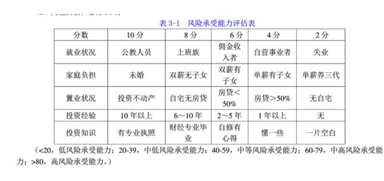 通过风险承受能力和风险承受态度评测表,可以获得客户的风险特征。结合风险能力和风险态度两个方面